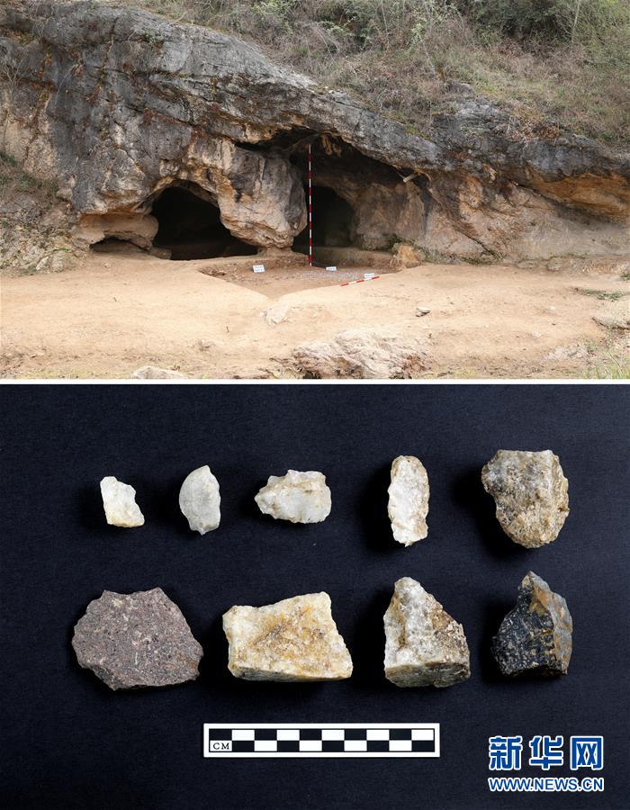 陕西南郑疥疙洞旧石器时代洞窟遗址近景(上图)、疥疙洞遗址出土的石成品(下图)(拼板材料照片)。新华社发(外国文物报社供图)