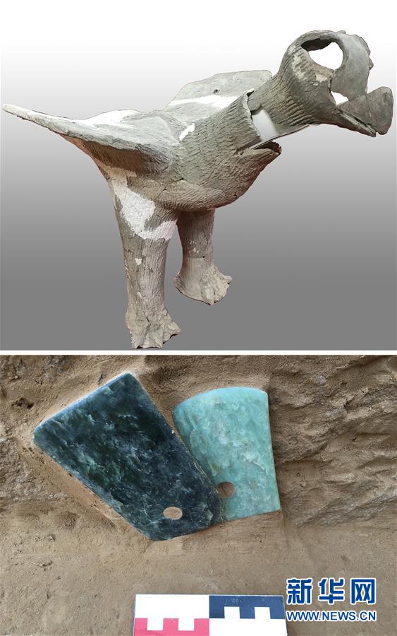 陕西神木石峁遗址皇城台出土的陶鹰(上图)和玉钺(下图)(拼板材料照片)。新华社发(外国文物报社供图)